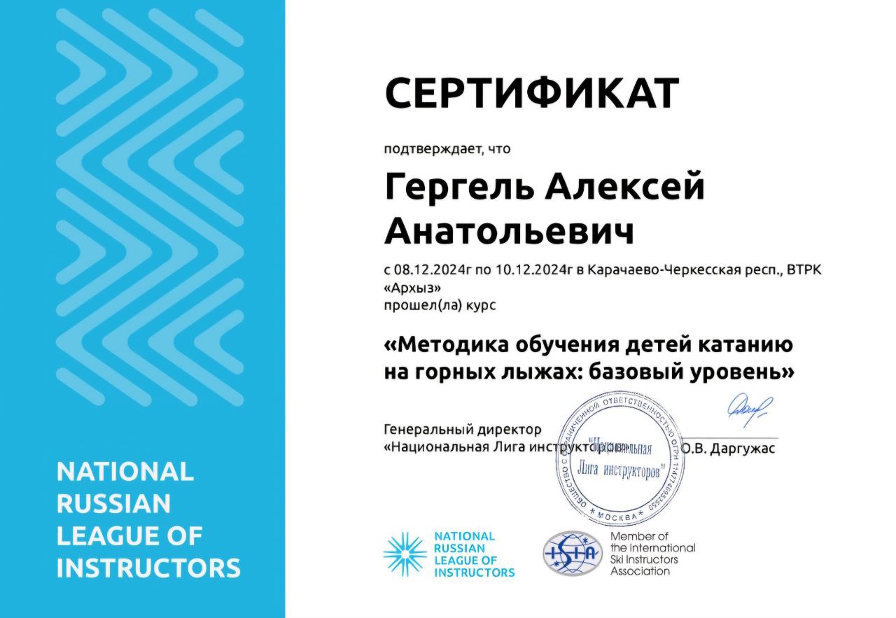 Квалифицированный инструктор международной категории по горным лыжам ⛷️ и сноуборду 🏂«НЛИ -Национальная лига инструкторов» категории "С", официаьно аккредитованный инструктор на курорте Архыз
